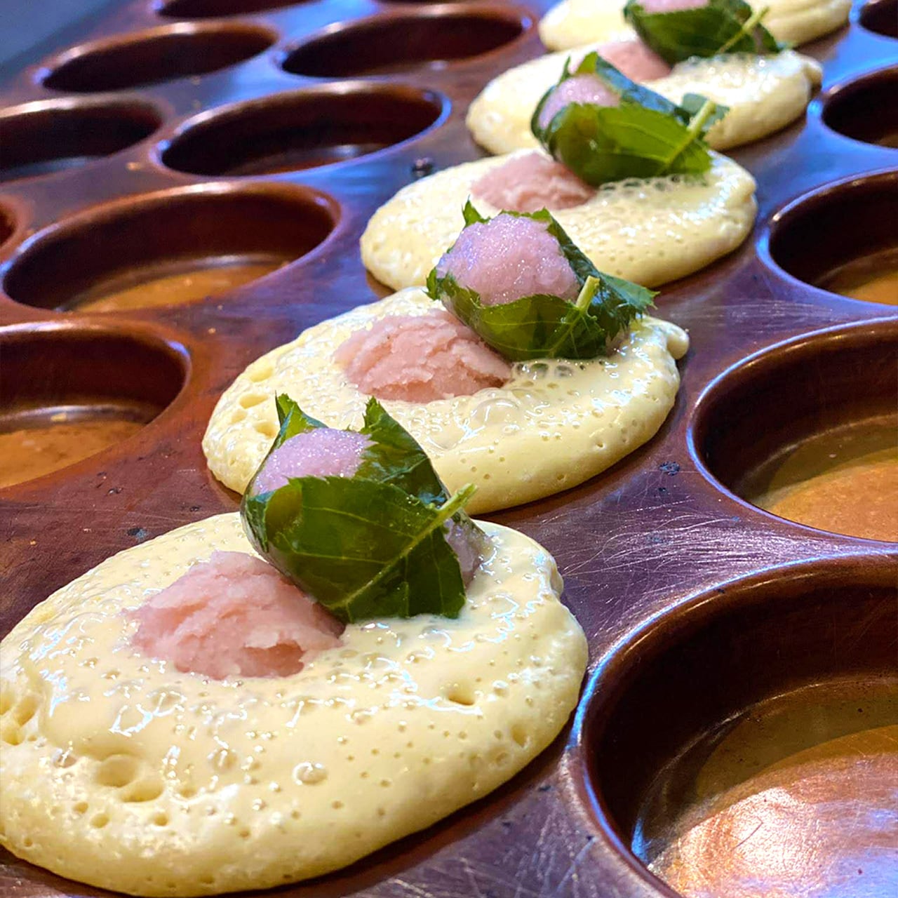 しっとりと焼き上げた生地の中には、ほんのり塩気の効いた桜餅をまるごと一つ包み込みました。もちっとした食感、そしてふわりと広がる桜の香りが重なり合い、ひと口で春が満開に広がります。