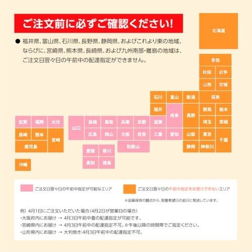 ・ご注文時、システムの仕様上、日時指定はできますが、宮崎県、熊本県、長崎県、および九州南部・離島の地域は、ご注文日翌々日の午前中の配達指定ができません。